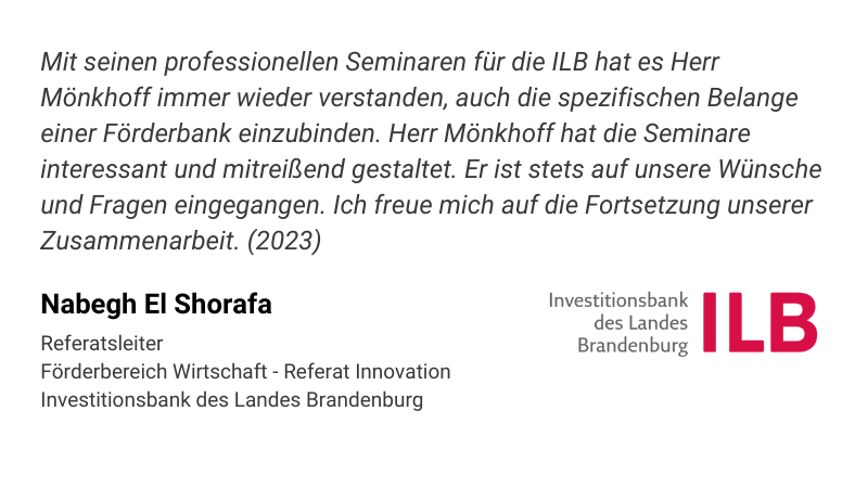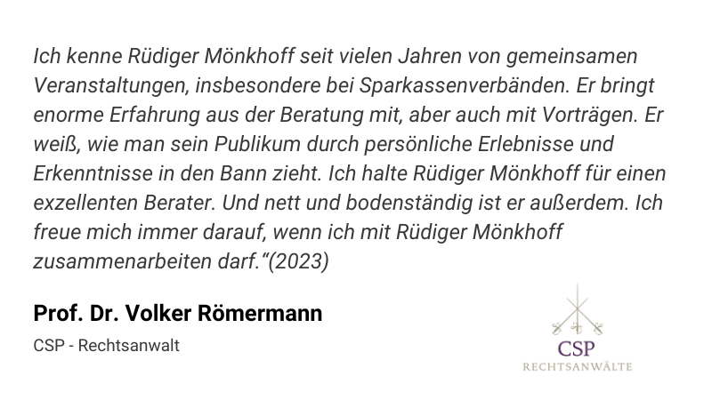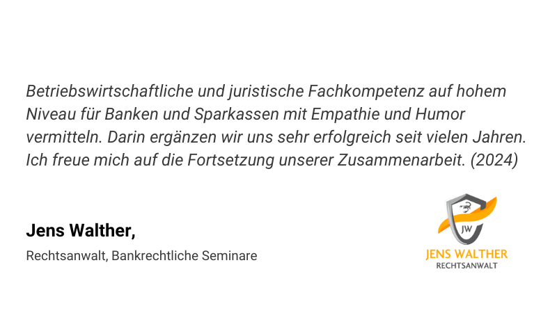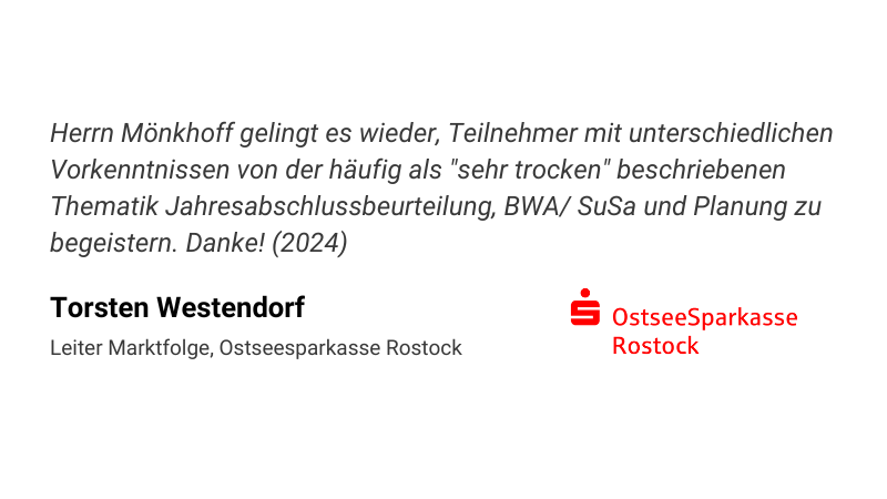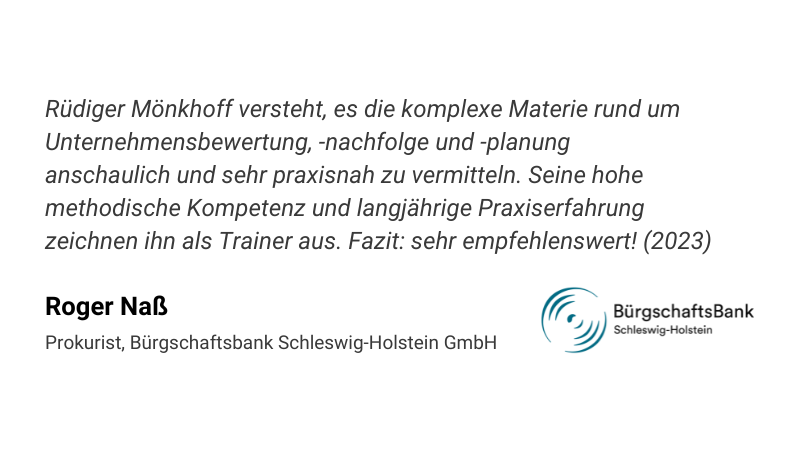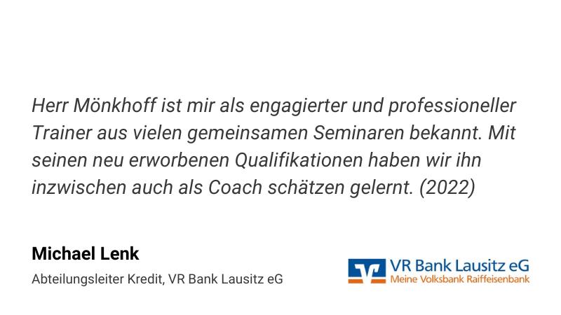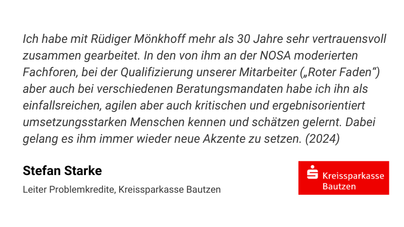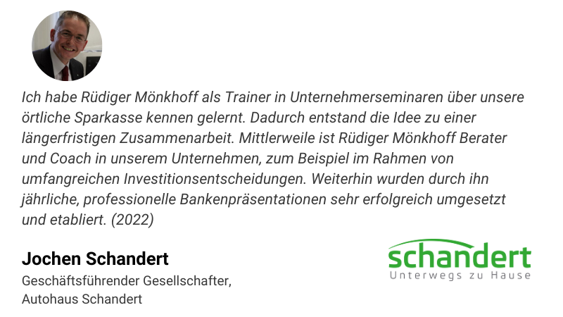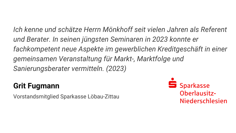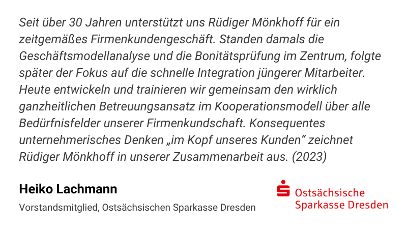 Seit 30 Jahren bin ich in der Beratung mittelständischer Unternehmen und der Weiterbildung für Banken, Sparkassen und Unternehmer tätig. Ich vereine betriebswirtschaftliche Fachkompetenz mit eigener Führungs- und Lebenserfahrung. Vertrauen ist die Basis für die langjährige Begleitung von Unternehmen, Sparkassen/ Volksbanken und Förderbanken. Dieses Vertrauen meines Netzwerkes ermöglicht Lösungsansätze auch in komplexeren Unternehmensphasen.