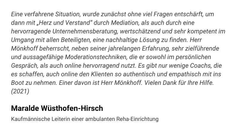 Bei meiner Arbeit als Trainer und Berater steht das "Mensch sein" im Mittelpunkt. Eine Zusammenarbeit auf Augenhöhe, bei der Ihre Individualität und Lebensleistung im Fokus stehen, ist mir wichtig. Statt schnellen Antworten stelle ich gute Fragen, um professionelle Unterstützung bei der Bearbeitung Ihrer Themen zu leisten.