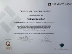 Mit einer Ausbildung zum zertifizierten Business-Coach nach dem TheKey-System konnte ich meine bereits seit vielen Jahren bestehende Coachingtätigkeit und -kompetenz um weitere, ergänzende Komponenten erweitern. Persönlichkeits- und Führungskräfteentwicklung, weitergehende Kenntnisse zur Konfliktbewältigung, Resilienzaufbau sowie zu Change-Prozessen/ Agilität haben meine Möglichkeiten der erfolgreichen Begleitung von Entwicklungs- und Veränderungsprozessen erweitert.